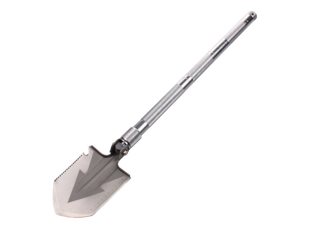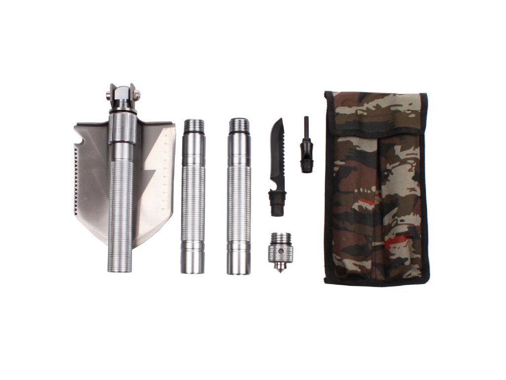 Scout multifunkční lopatka uspokojí potřeby všech uživatelů, kteří rádi tráví svůj volný čas v přírodě. Víceúčelová lopatka se skvěle hodí na kempování, skautské výpravy, nebo své využití nalezne na zahradě. Multifunkční lopatka Scout je vyrobená z oceli, rukojeť má vroubkovaný povrch pro lepší uchopení. Hlavu lopatky lze použít navíc jako pilku, otvírák lahví a k prosekávání křoví. Lopatka je polohovatelná o 180 stupňů, to umožňuje její využití i jako motyčku. Rukojeť je rozdělena na tři části, které jednoduše odšroubujete. V rukojeti naleznete taktický nožík, píšťalku a křesadlo na rozdělání ohně. Ukončení rukojeti nabízí kovový hrot pro nouzové rozbíjení skla. Celá multifunkční lopatka je složena v praktickém obalu s maskáčovým vzorem. Výrobek je vhodný pro osoby starší 18ti let nebo pro použití pod dohledem dospělé, zodpovědné osoby. Šířka hlavy lopatky: 12,5 cm Délka hlavy lopatky: 16 cm Celková délka lopatky: 78 cm Hmotnost lopatky s obalem: 1,2 kgDoplňkové parametry