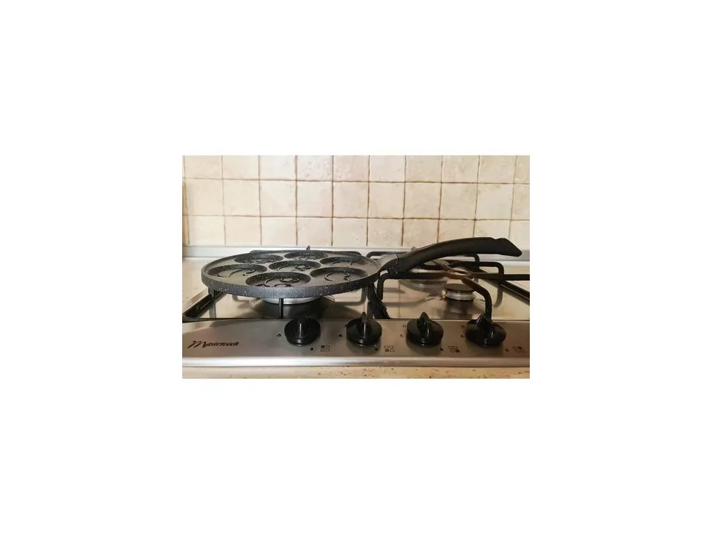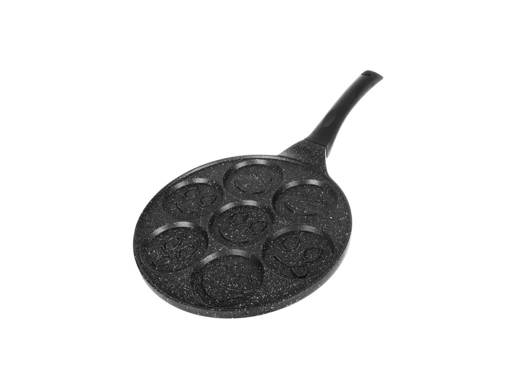 - SPECIFIKACE - materiál: hliník; povlak: nepřilnavý; bez: PFOA; Černá barva; velikost jedné placky: 6,5 cm; velikost pánve: 26 cm; hmotnost: 1,096 kg; hmotnost v balení: 1,196 kg.