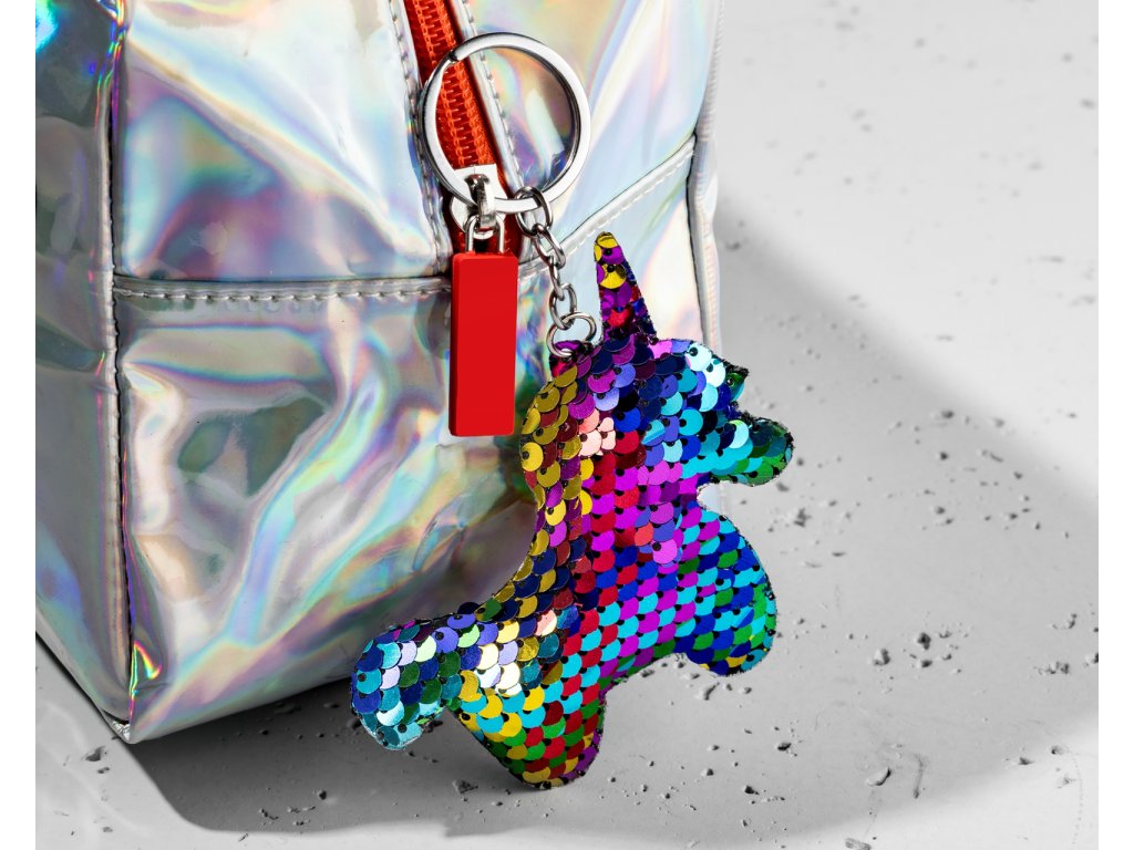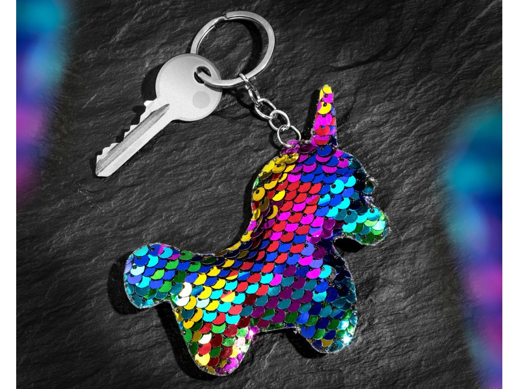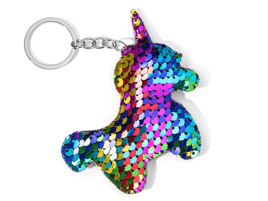 Okouzlující přívěsek na klíče ve tvaru jednorožce, tvořený barevnými flitry. Dokonalý módní doplněk nejen na klíče, ale také na batoh nebo kabelku.