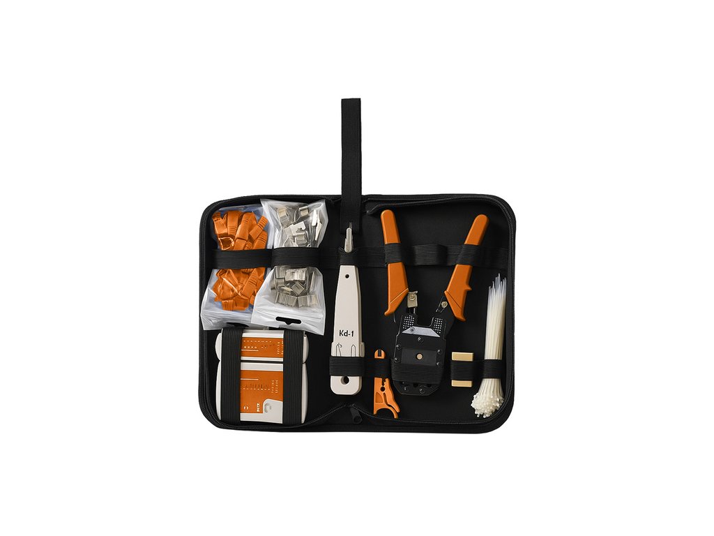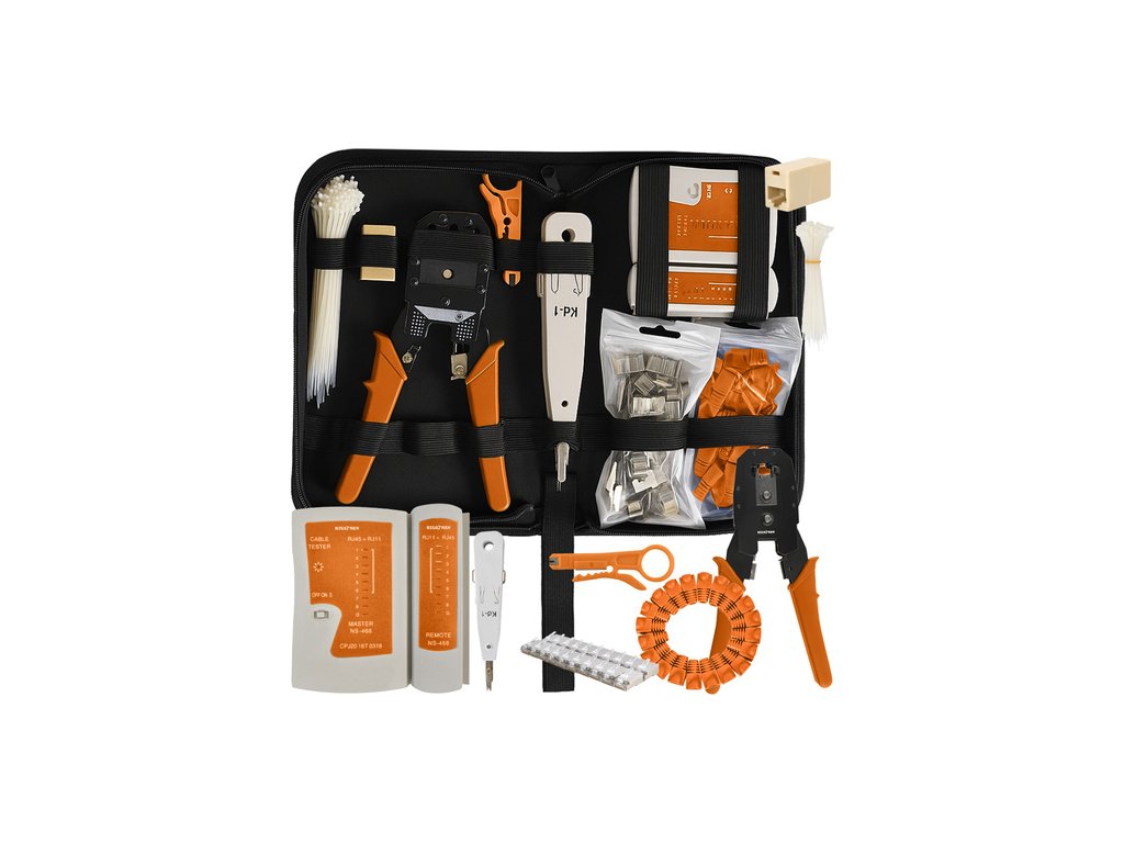 - nářadí je pohodlné a připravené k práci - sada síťového nářadí obsahuje kompletní sadu užitečných nástrojů: krimpovací kleště, odizolovací kleště, děrovač, konektory RJ45 a krytky, vše zabalené v estetickém pouzdře, takže můžete ihned začít s instalací nebo opravou sítě