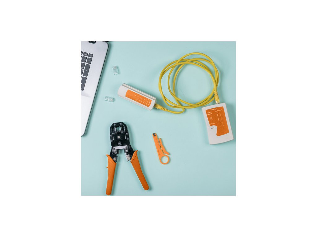 - vybavení je solidní a dobře vyrobené - krimpovací kleště RJ45 mají kovový mechanismus a pohodlnou rukojeť a tester kabelů má odolné pouzdro a jasný LED indikátor, Celé bylo navrženo s ohledem na odolnost a pohodlí