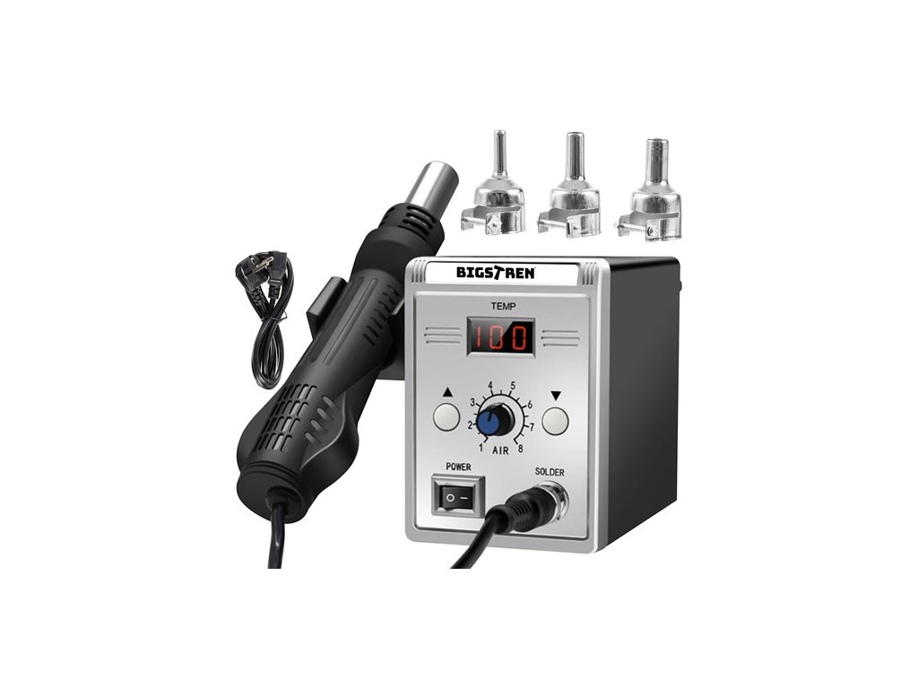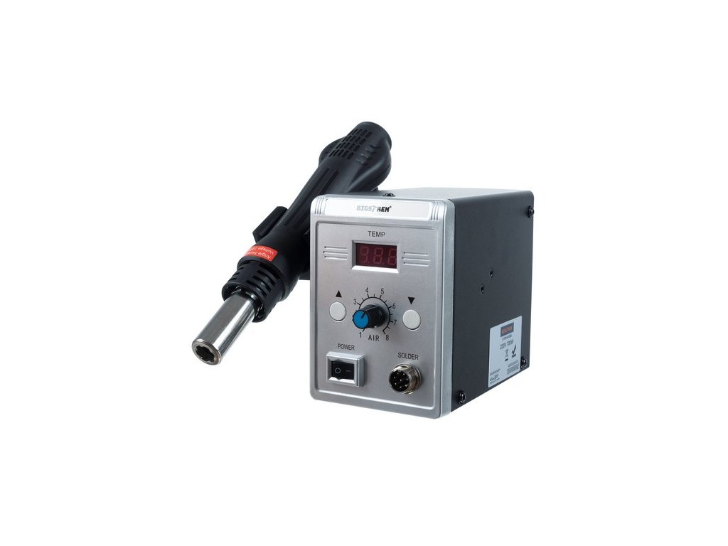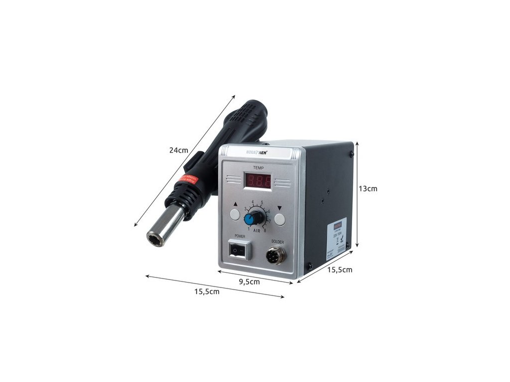 - SPECIFIKACE - materiál: železo, ostatní: ABS + nerez + pryž; LCD displej; výkon: 700 W; napětí: 220V; provozní teplota: od 100 do 500 stupňů Celsia; maximální množství vzduchu 120 l/min; keramické topné jádro; délka pažby: 24 cm; rozměry stanice: 9,5 x 15,5 x 13 cm; hmotnost: 0,998 kg; hmotnost balíku: 1,243 kg.