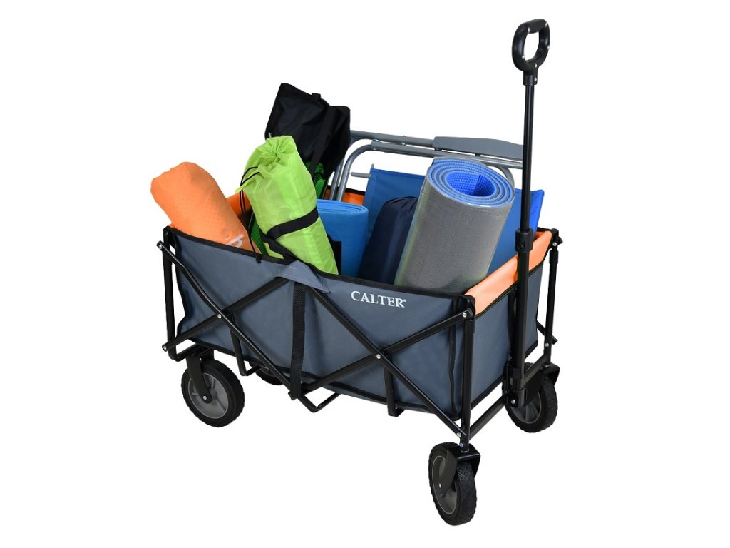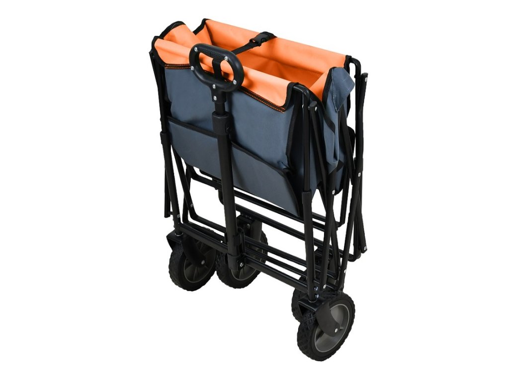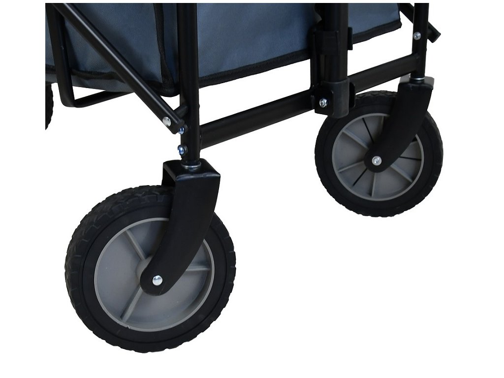 Skládací campingový vozík je velmi univerzální, můžete v něm vozit nákup, věci na výlet a podobně. Ve složeném stavu nezabere vozík skoro žádné místo, a tak by neměl chybět v žádné domácnosti. Vejde se do každé předsíně, sklepa nebo do garáže. Vozík můžete snadno ovládat jednou rukou a díky kolečkům otočným o 360° s ním lze velmi snadno manipulovat. Rám ze stabilních ocelových trubek zajišťuje nosnost nákladu až 80 kg.Upozornění: Nevhodné pro přepravu dětí. Nejedná se o dětskou hračku.