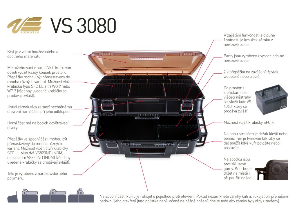 Kryt je z velmi houževnatého a odolného materiálu. Mikrožebrování v horní části kufru vámdovolí využít každý kousek prostoru. Přepážky mohou být přenastaveny do mnoha různých variant. Možnost vložit krabičku typu SFC LL a tři WG 9 nebo WP 3 (všechny uvedené krabičky se prodávají zvlášť). Tělo je vyrobeno z nárazuvzdorného polymeru. K zajištění funkčnosti a dlouhé životnosti je kroužek zámku z nerezové ocele. Panty jsou vyrobeny z vysoce odolné nerezové ocele. Do prostoru s příčkami na vláčecí nástrahy lze vložit kufr VS4060, který se prodává zvlášť.Horní část má na bocích odvětrávací Možnost vložit krabičky SFC F. otvory. Přepážky ve spodní části mohou být přenastaveny do mnoha různých variant. Možnost vložit čtyři krabičkySFC LL plus dvě VS820ND (NDM) nebo sedm VS820ND (NDM) (všechny uvedené krabičky se prodávají zvlášť). Jistící zámek víka zamezí nechtěnému otevření horní části při jeho odklopení. 2 × přepážka na zavěšení třpytek, wobblerů nebo pilkrů. Na obou stranách je držák kleští nebo peánu. Ten je tvarován tak, aby se dal použít když kufr položíte nebo i postavíte. Na spodku jsou protiskluzové gumy. Kufr bude držet na místě i při použití na lodi.Doplňkové parametry