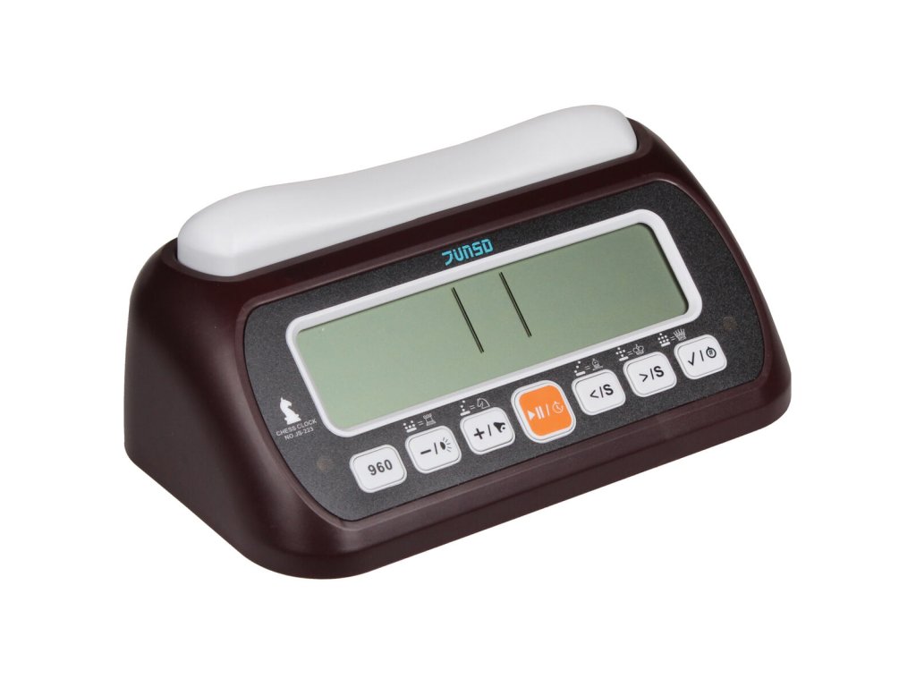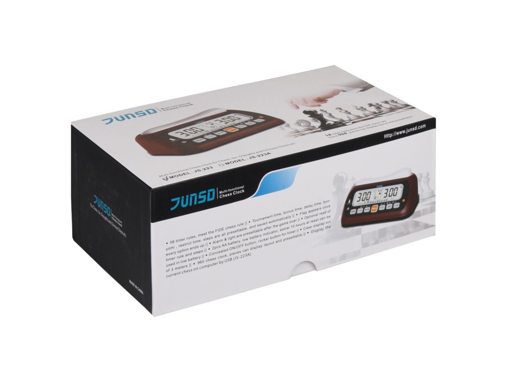 Elektronické šachové hodiny JUNSD JS-223 jsou vytvořené pro profesionální šachisty a turnaje, ale také pro náročné amatérské hráče, kteří chtějí svou hru posunout na další úroveň. Splňují normy Světové šachové federace FIDE. Napájení: AA baterie, 2 ks. Funkce: 20 různých nastavení obsahujících všechny populární standardy; přídavná manuální nastavení pro veškeré metody; všech 20 manuálních nastavení jsou ve výchozím nastavení paměti; 38 přednastavených funkcí pro rychlé a jednoduché použití; nastavitelné zvukové upozornění pro vypršení času; nastavitelné podsvícení pro upozornění vypršení časového limitu; 960 šachových hodin; indikátor nízkého stavu baterií.Doplňkové parametry