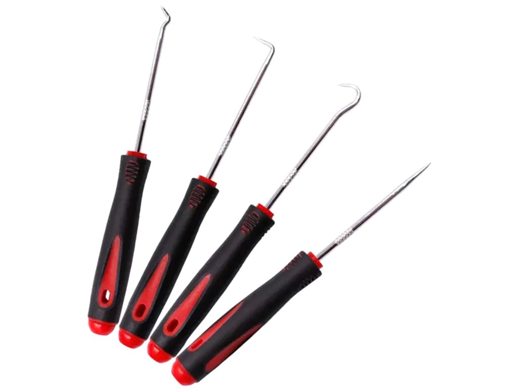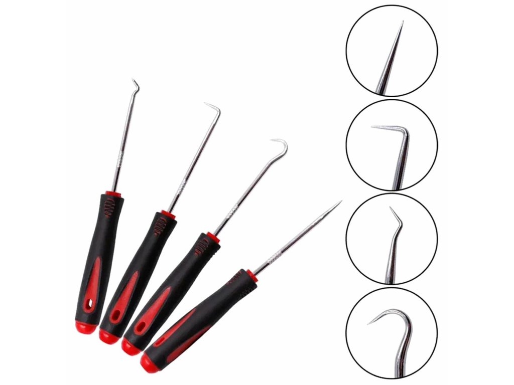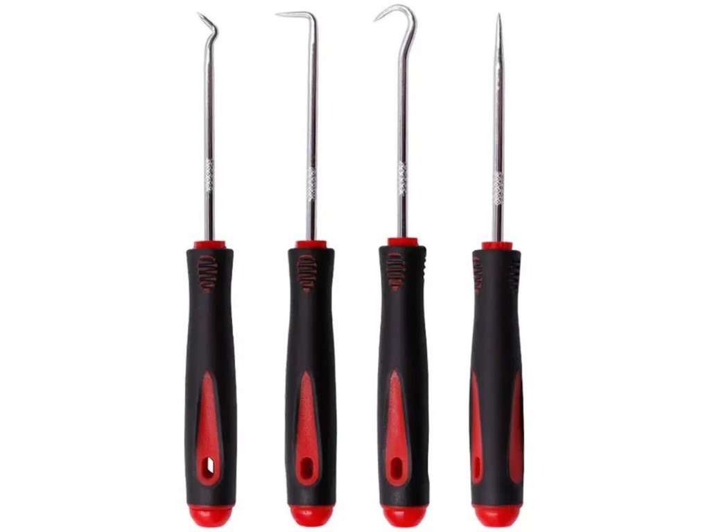 Sada 4 univerzálních háčků na nářadí. Usnadňují páčení, tahání a manipulaci s těžko dostupnými pryžovými prvky. Praktické rukojeti vám umožní snadno ovládat každý háček. Pevná kalená ocel umožňuje dlouhé a bezproblémové používání.