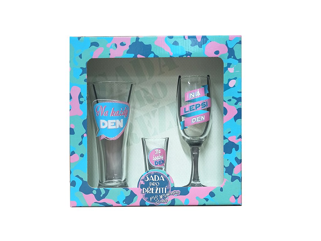 Dárkový balíček "Sada pro přežití" obsahuje sklenici na míchaný nápoj, na prosecco a na štamprlku.