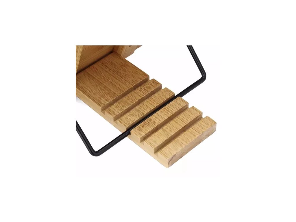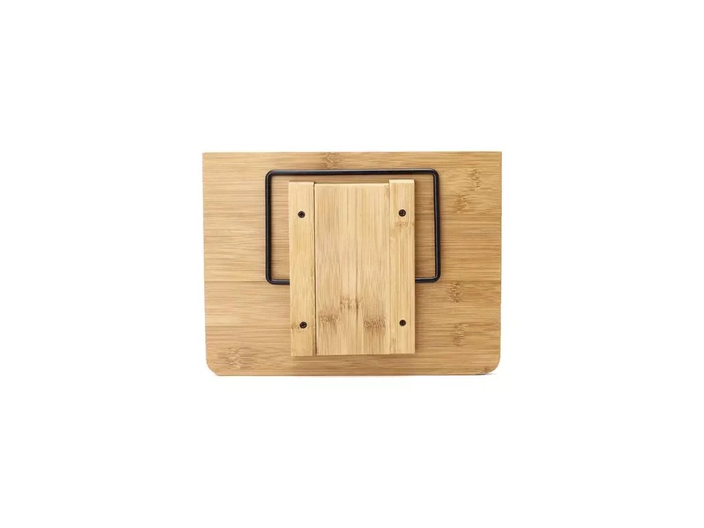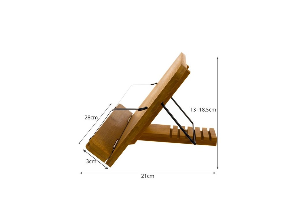 - SPECIFIKACE – materiál: bambus / železo; rozměry stojanu: 28 x 3 cm; rozměry: 21 x 28 x 13-18,5 cm; hmotnost: 779 g; hmotnost balení: 882 g.