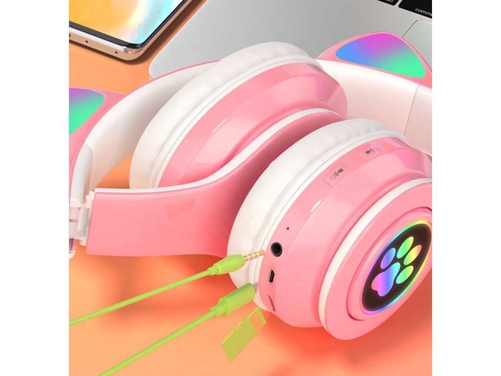 Pohodlná bezdrátová sluchátka přes uši pro děti. Charakteristické kočičí uši s LED podsvícením nechá vaše dítě vyniknout z okolí. Použití rychlého modulu Bluetooth 5.0 umožňuje pohodlné používání zařízení (dosah až 10 metrů). Napájení vestavěnou baterií Je to skvělá a velmi praktická vychytávka pro aktivní lidi a všechny, kteří si cení pohodlí při používání zařízení. Pohodlné náušníky a redukce hluku tlumí zvuky přicházející zvenčí a výrazně zlepšují kvalitu přehrávané hudby. Díky promyšlenému designu jsou extrémně lehké a pohodlné. Vestavěná fyzická tlačítka usnadňují ovládání funkcí sluchátek. Vybaveny vestavěným FM rádiem a čtečkou paměťových karet microSD s MP3 přehrávačem umožňují používat zařízení bez připojení k chytrému telefonu.