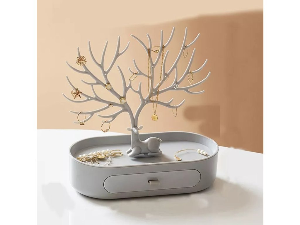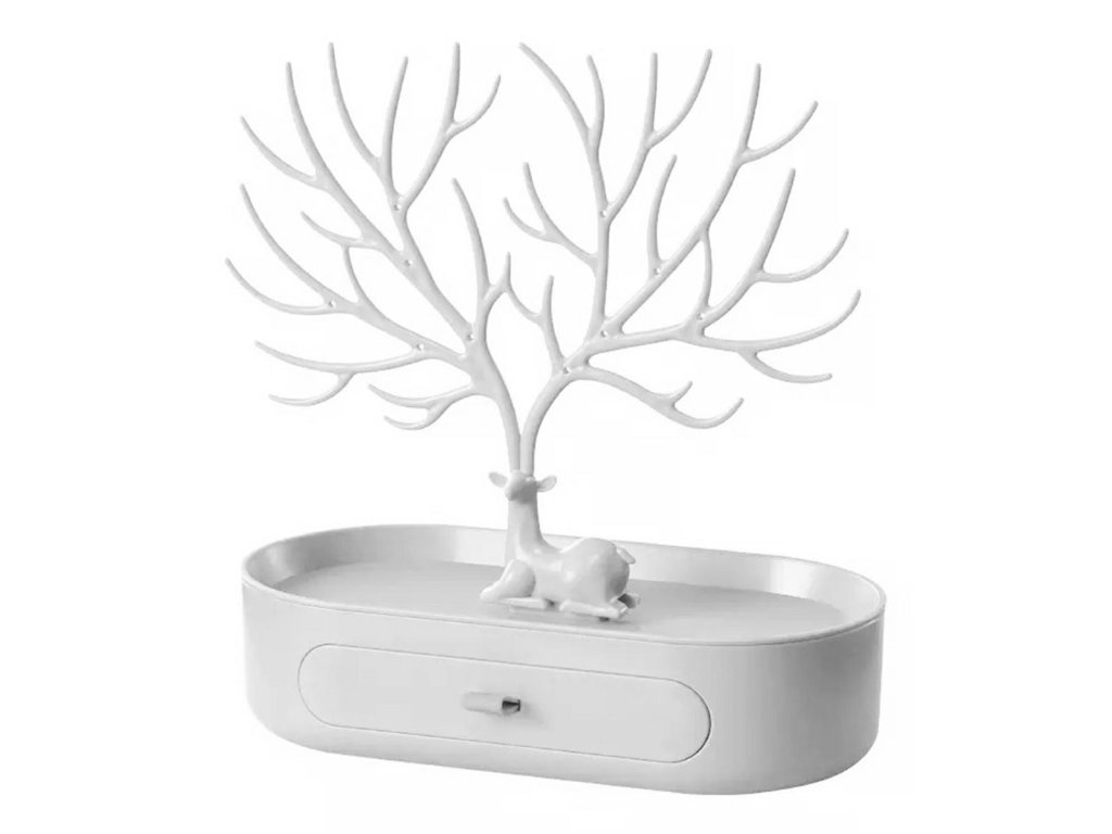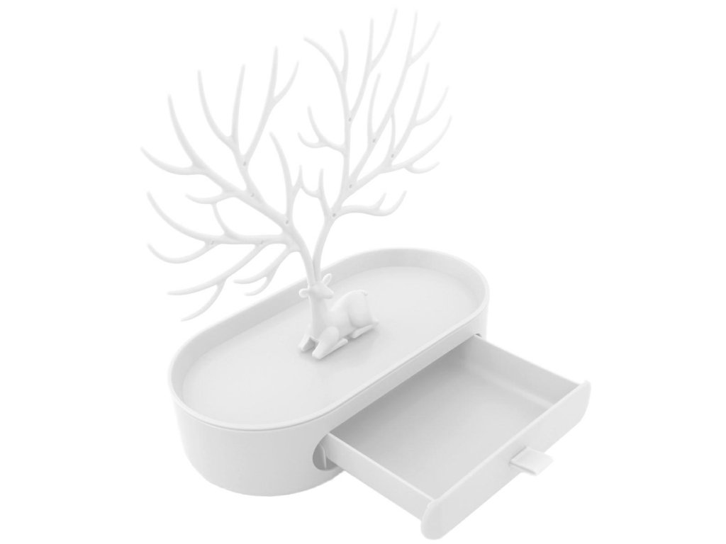 Praktický stojan na šperky ve tvaru jelena. Nezbytný pro každou ženu, která si chce uspořádat svou sbírku náramků, hodinek a dalších šperků a vystavit je estetickým způsobem. Skvěle poslouží i na všech výstavách a výlohách, v klenotnictví nebo v zastavárně. Díky tomu, že je vybaven mnoha úchyty (větvemi) a velkým stojanem s uzavřenou zásuvkou, můžeme na něj umístit ještě více hodinek nebo šperků.