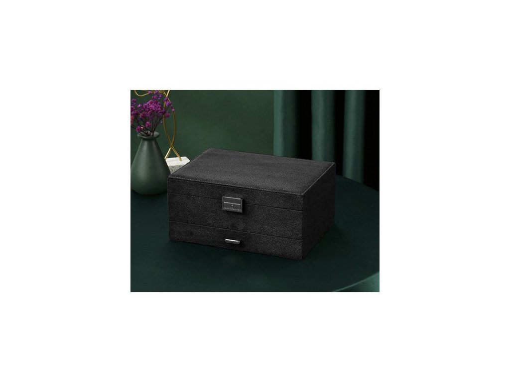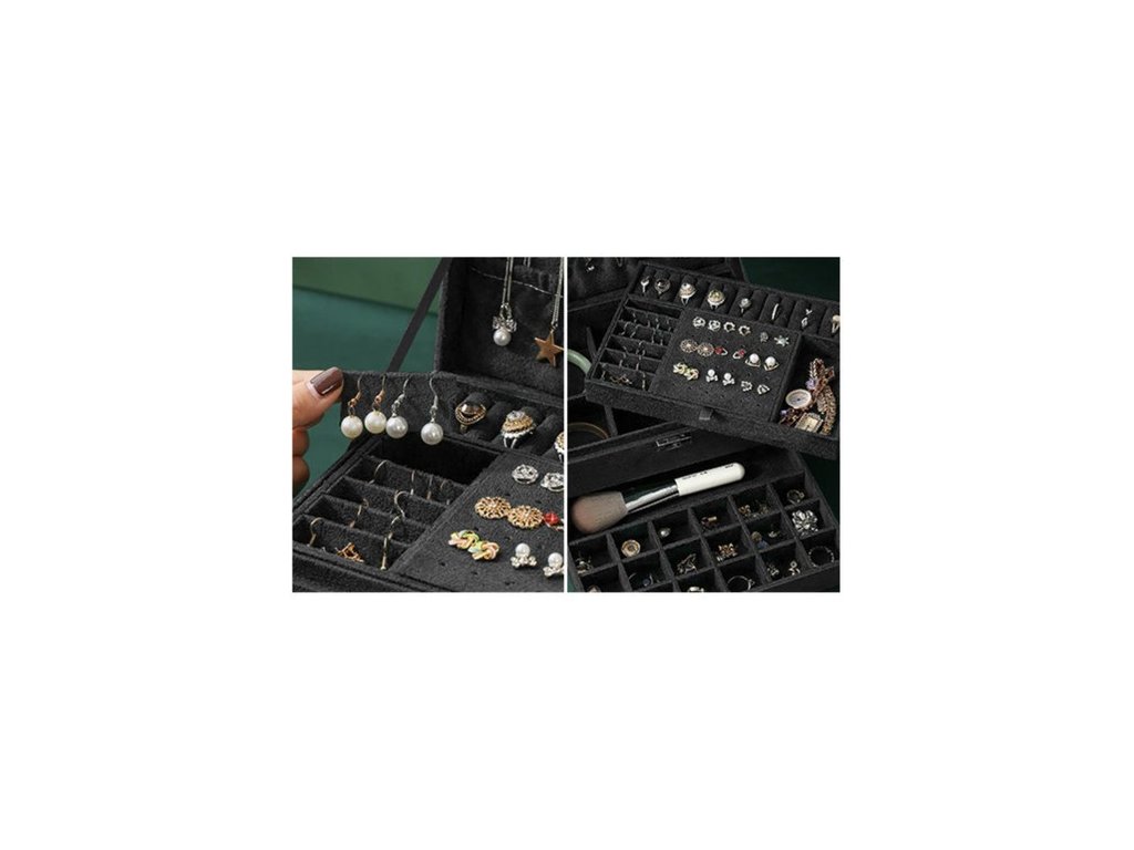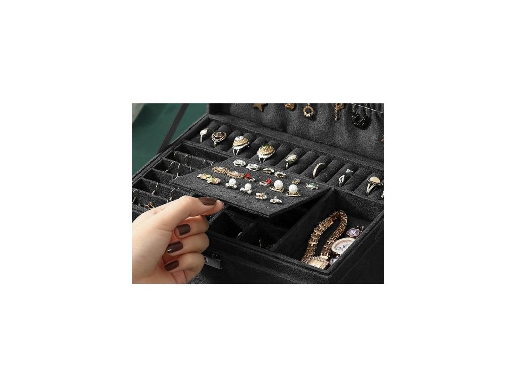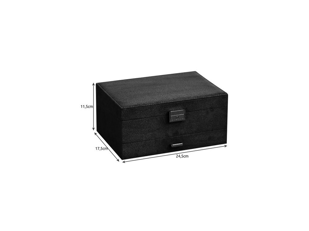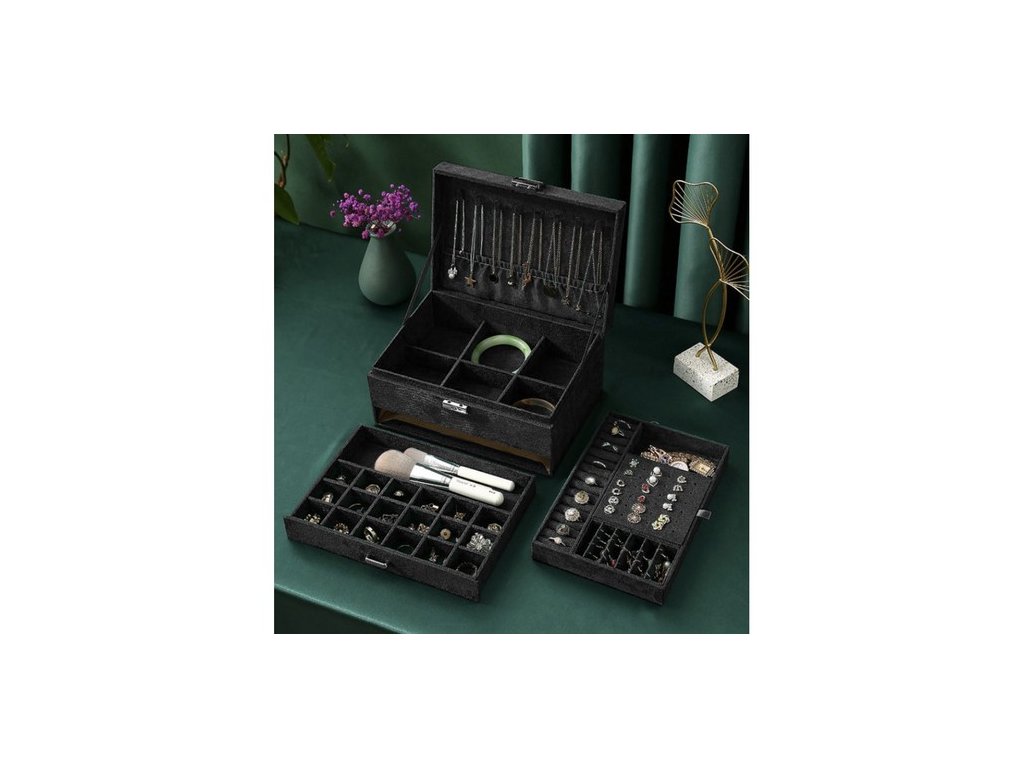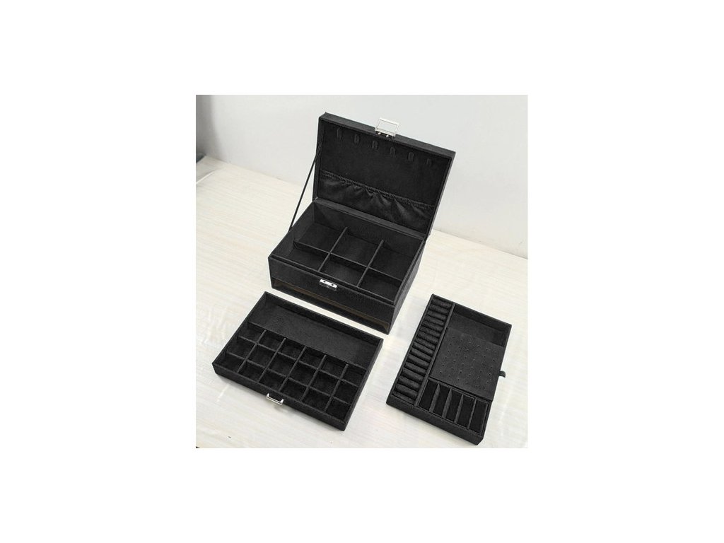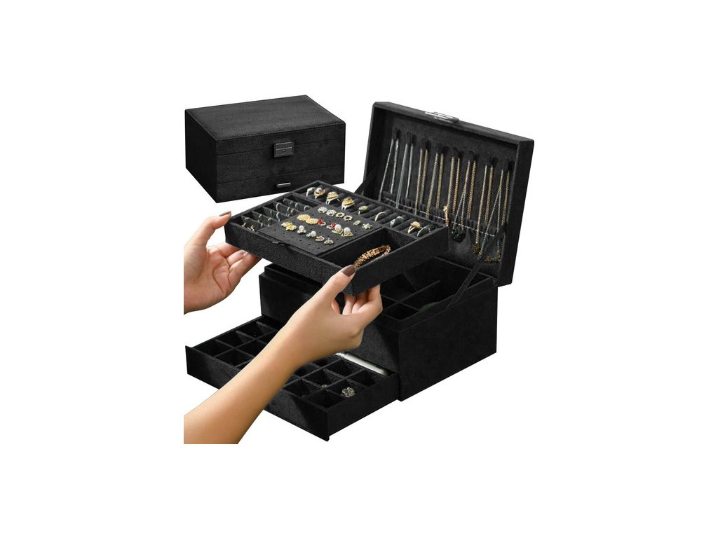 - SPECIFIKACE - barva: černá; 8 řetízkových závěsů; 15 kruhových slotů; 6 úzkých přihrádek; 1 elastická kapsa; 18 míst pro náušnice; 9 přihrádek na přívěsky; 6 velkých přihrádek; 18 přihrádek v zásuvce; 1 podlouhlá přihrádka na hodinky; rozměry uzavřeného kufru (délka / šířka / výška): 11,5 x 24,5 x 17,5 cm; hmotnost: 0,959 kg. hmotnost v balení: 1,186 kg.