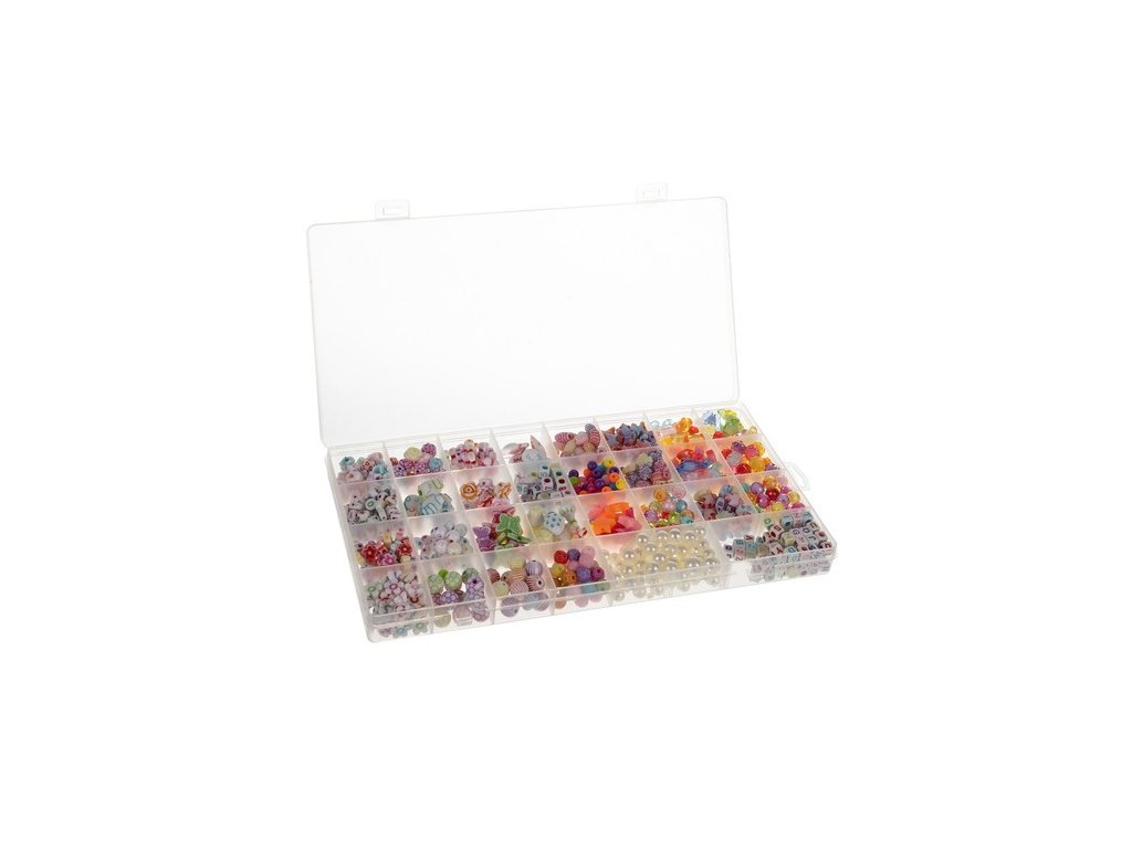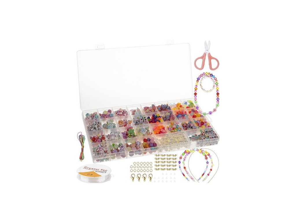 - XXL SET V ORGANIZÁTORU – sada 900 prvků umožní Vašemu dítěti vytvářet šperky v různých tvarech a s různými motivy. Do sady obsahuje: korálky, obruče na čelenku, vlasec, provázek, spony a spojky.