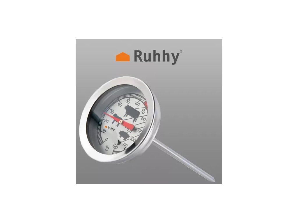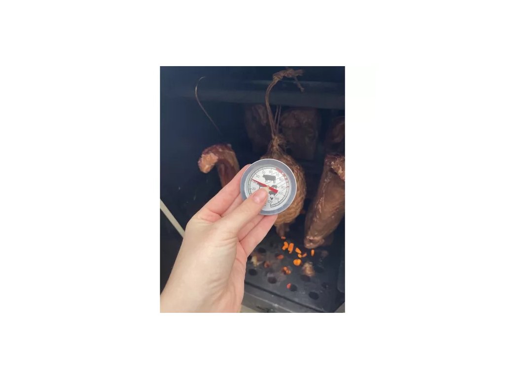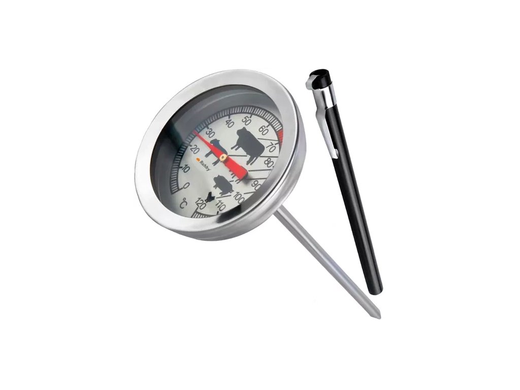 Vynikající analogový teploměr nejen pro udírny - má široké uplatnění v gastronomii, jak pro domácí použití, v restauracích, tak v potravinářském průmyslu. Teplotu uzeného masa (nebo jiného pokrmu) můžete snadno zkontrolovat a zajistit tak jeho vynikající kvalitu. Teploměr je vyroben z nerezové oceli. Má velmi praktické symboly pro optimální teplotu uzení pro konkrétní druh masa. Sada obsahuje uzávěr pro uložení sondy, který lze využít i k jejímu uchycení - má praktický "klip" jako propiska.