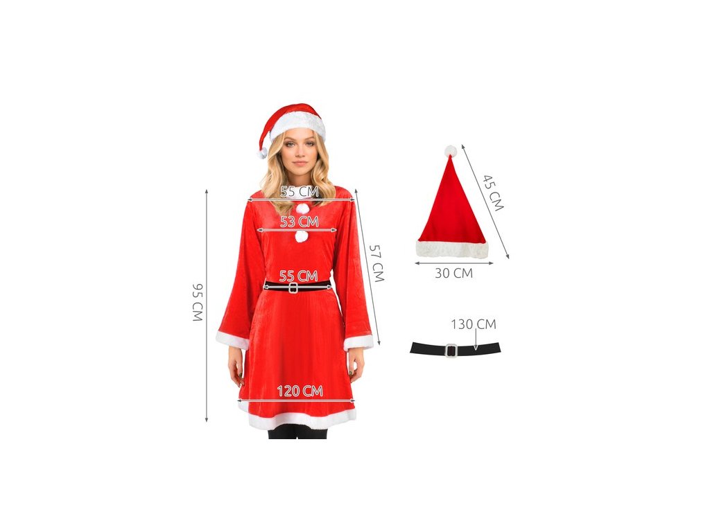- SPECIFIKACE - materiál: imitace sametu; barvy: červená/bílá/černá; rozměry: šaty (ramena/pas/dole): 55x55x120cm; klobouk (délka/šířka): 45x30cm; popruh (délka): 130cm; celková délka: 95 cm; * rozměry měřeny naplocho; hmotnost: 303g; hmotnost v balení: 345 g.