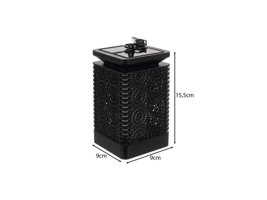 - SPECIFIKACE - barva: černá; barva osvětlení: teplá bílá (imitace plamene); materiál: ABS, železo; soumrakový senzor: ANO; baterie: 3,7V 600mAh; světelný zdroj: SMD LED; výkon: 1,2 W; světelný výkon: 30 lm; úhel osvětlení: 360 °; vodotěsné: IP44; doba nabíjení: 6-8 h; pracovní doba: 8 h; rozměry: 15,5 x 9 x 9 cm; hmotnost: 0,2 kg; hmotnost balení: 0,3 kg.