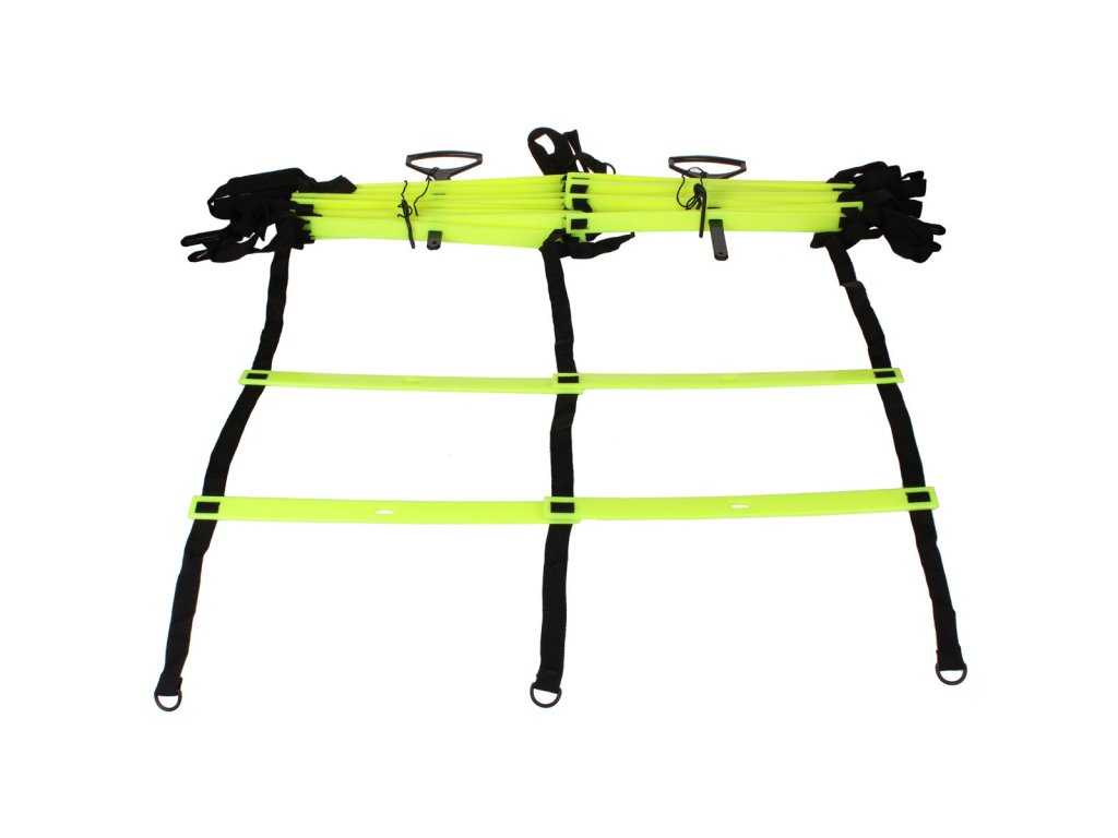 Dvojitý agility žebřík pro kondiční přípravu sportovců. Plastové příčky žebříku jsou snadno nastavitelné pro přizbůsobení vzdálenosti mezi jednotlivými příčkami podle potřeb uživatele. Unikátním vylepšením jsou madla, která je možné protáhnout středy obou žebříků. Madla pak slouží nejen jako nosič, ale zabraňují i zamotání žebříků. Agility žebřík 9 m lze pomocí suchého zipu rozdělit na dva kusy 4,5 m dlouhé. Žebřík je široký 80 cm. Hmotnosti žebříků jsou 1,7 a 3,2 kg. Upozornění: Agility žebříky neslouží v žádném případě k lezení, nýbrž ke cvičení techniky a rychlosti sportovců na zemi.Doplňkové parametry